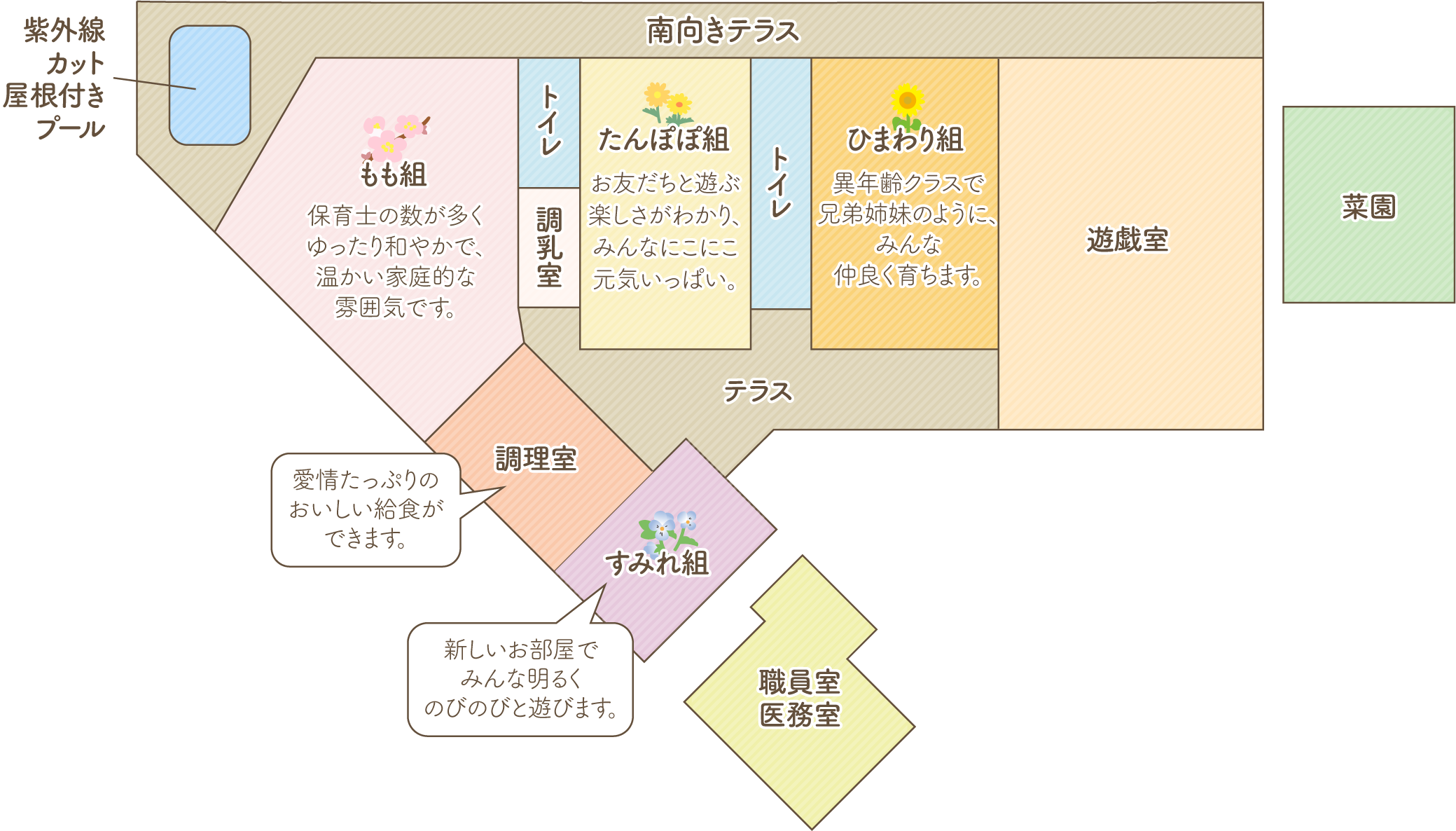 子ども一人ひとりの人権や主体性を尊重し、心身共に健やかな成長ができるように優しく温かく見守ります。又、家庭や地域と連携を図りながら、保護者や地域の子育て家庭に寄り添い、皆様から信頼され愛される保育園をめざします。