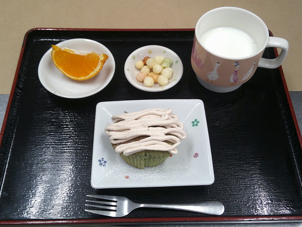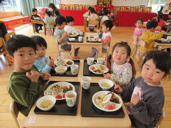 給食では、みんなで鬼っ子ハンバーグをおいしくいただきました。