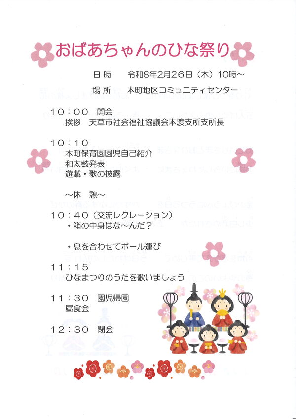 2月26日(木)に、本町コミュニティーセンターで『おばあちゃんのひな祭り』がありました。