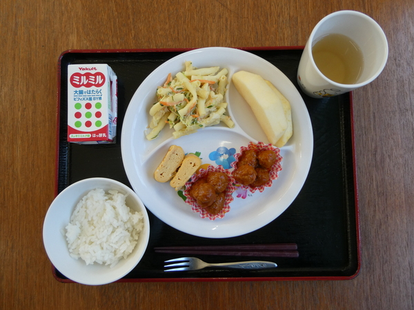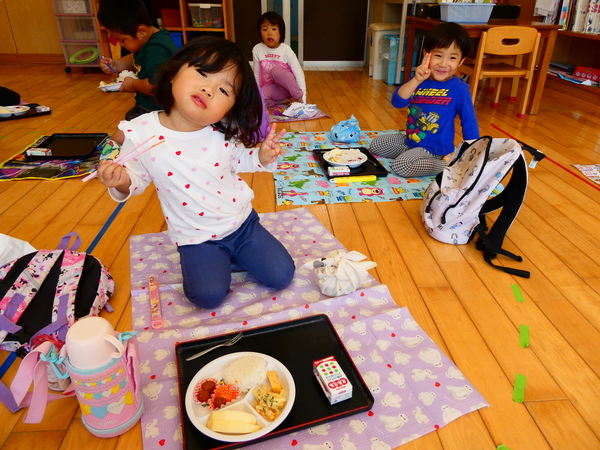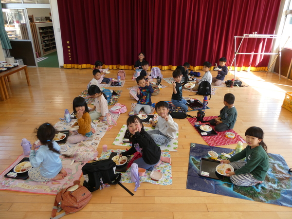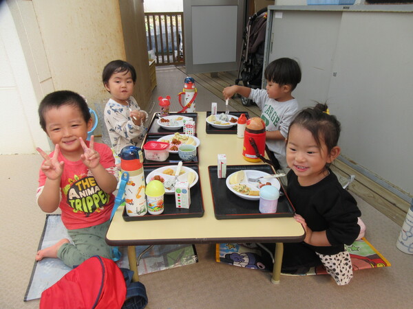 2025/11/06 えんそく 天気も良く、全クラス遠足へ出かけました。今日の給食は、えんそく用のメニューで、シートの上に座りおいしくいただきました。今日の献立:ミートボール、マカロニサラダ、玉子焼き、りんご、ミルミル 1 2